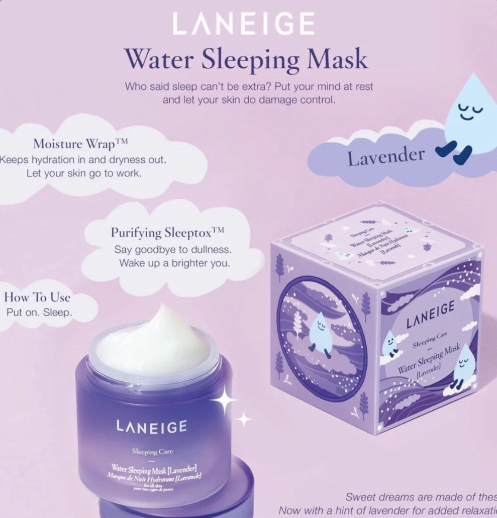 Le Water Sleeping Mask Lavender LANEIGE est la version parfumée à la lavande du masques de nuit best-seller qui purifie et recharge la peau pendant le sommeil. La formulation de ce masque s’appuie sur des technologies innovantes telles que SLEEP-TOX qui purifie la peau pendant la nuit pour la maintenir dans un état optimal, MOISTURE WRAP qui aide la peau à conserver son hydratation tout au long de la nuit, et SLEEPSCENT qui t’aide à te détendre. Profite d’un meilleur sommeil, plus réparateur, grâce au parfum relaxant de la lavande, et réveille-toi avec une peau éclatante qui paraît radieuse et se sent parfaitement rafraîchie et douce !